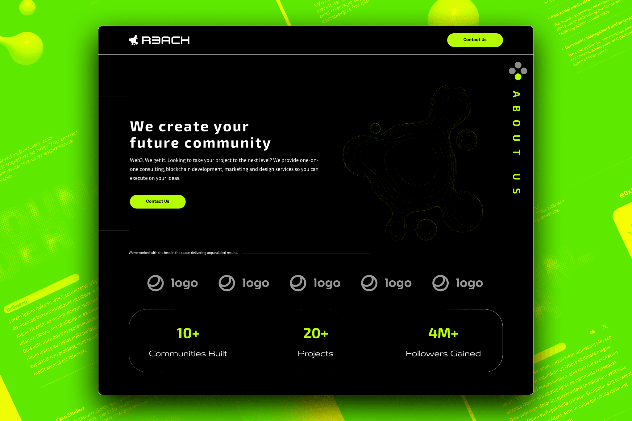 R3ACH brand was about seamlessly integrating fluidity and futurism into the Web3 and blockchain realm. The logo's dynamic dance not only echoes decentralized innovation but also evoking a sense of decentralized innovation and highlighting the paramount importance of connection